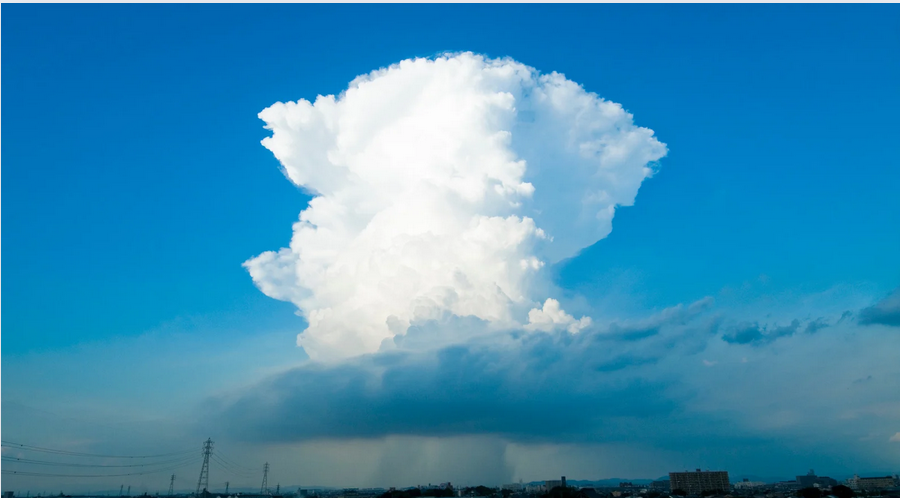 積乱雲(入道雲): モクモクと背の高い雲は、夏によく見られます。上部が平らになり、かなとこ雲と呼ばれる特徴的な形になったら、雷雨や突風、ひょうが降る可能性が非常に高くなります。積乱雲は、短時間で急激に発達するため、見つけたらすぐに安全な場所に避難しましょう。