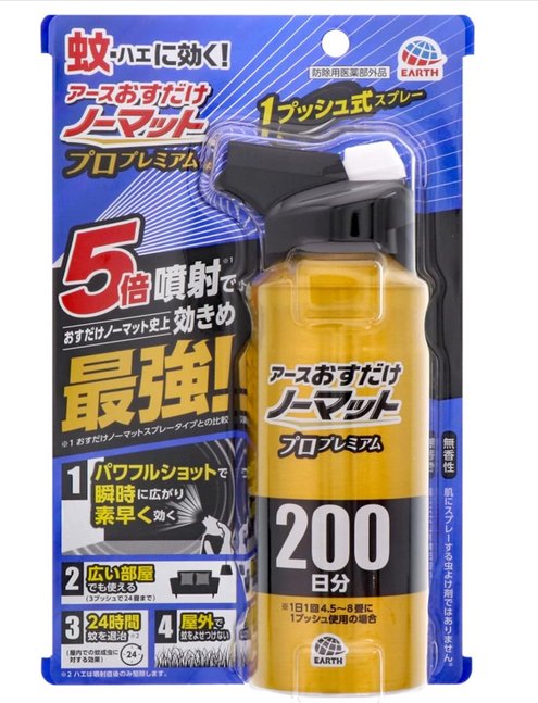 アース製薬 おすだけノーマット スプレータイプ プロプレミアム: メトフルトリン配合で、火や電池を使わない、ワンプッシュで蚊を駆除できるスプレーです。1プッシュで薬剤が瞬時に広がり、蚊を落とします。