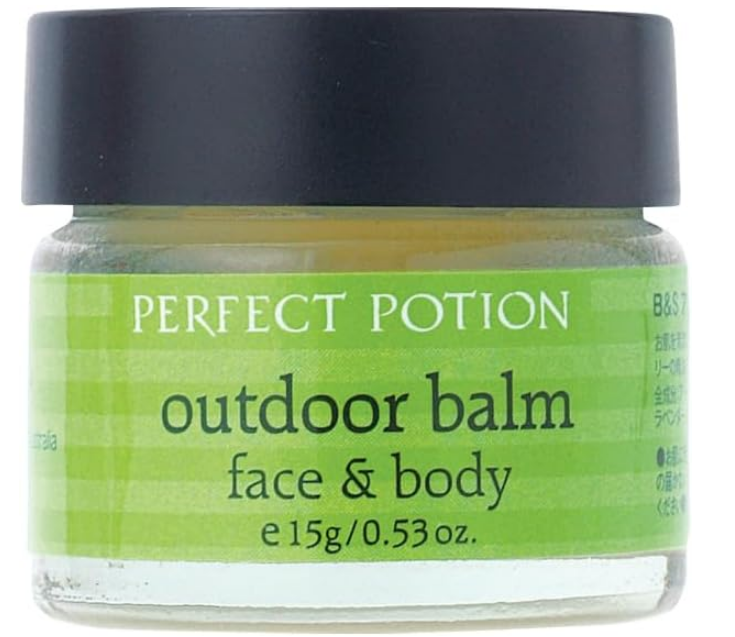 PERFECT POTION アウトドアバーム: シトロネラ、ペパーミント、ティーツリーなどの天然精油を配合した、爽やかな香りの虫除けバーム。肌に優しく、保湿効果も期待できます。